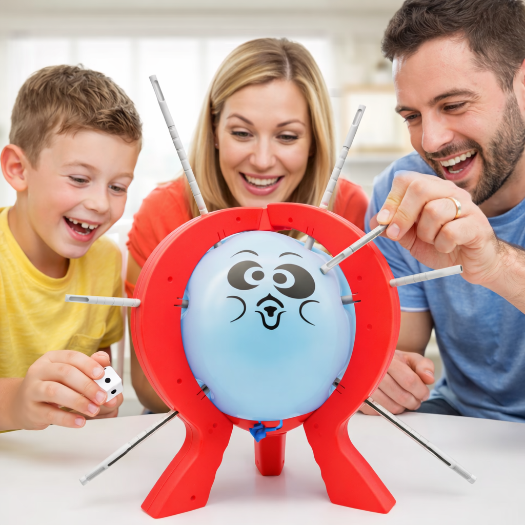¡La tensión está en el aire! es un divertido juego de habilidad donde cada jugador lanza el dado y debe insertar una varilla en el globo según el número que le toque. Pero cuidado… cada varilla que entra aumenta el suspenso, porque en cualquier momento el globo puede explotar.